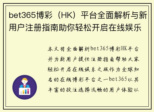 本文将全面解析bet365博彩(HK)平台,并为新用户提供注册指南,帮助大家轻松开启在线娱乐之旅。作为全球知名的在线博彩平台之一,bet365以其丰富的投注选择、流畅的用户体验以及优质的客户服务在博彩行业中占据重要地位。本文将从四个方面进行详细阐述:首先是平台的基本特点与优势;接着是bet365的博彩项目和服务;然后是如何在bet365平台上进行账户注册及相关流程;最后我们将探讨平台的安全性与用户保障措施。通过这些内容的详细讲解,读者将能够深入了解如何高效利用bet365博彩(HK)平台并开始自己的在线娱乐之旅。